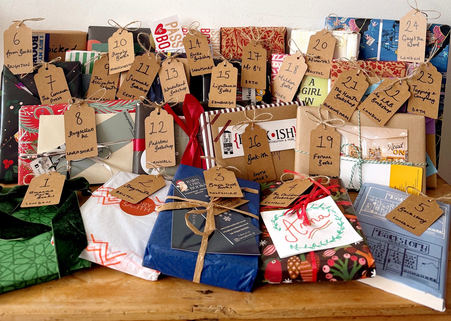 I absolutely love watching people open advent calendars and every year I watch people opening a variety of ridiculously expensive, niche, or absurd calendars. I also love books and independent bookshops so I thought why not make myself an indie bookshop advent calendar for myself? And nothing except my own time and budget was stopping me and so I did. I sent 24 indie bookshops a brief about my reading taste and bought a book from them unseen (and usually beautifully wrapped by them). I’m going to open one a day (sort of, I’m going to open them in small bursts so I don’t have to put makeup on every day or get up before a school visit to film one but I’m going to post one a day) and share on TikTok and Instagram from the 1st December (I’m @ acaseforbooks on both those platforms.)